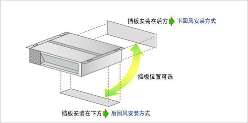 風管式室內機回風擋板為可拆卸方式,通過回風擋板位置調整,可將回風安裝為下回風或者后回風方式。