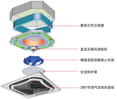 與平面回風(fēng)格柵相比,約克卡式天花室內(nèi)機(jī)(環(huán)形出風(fēng))獨(dú)有的球面回風(fēng)格柵具有更大的回風(fēng)面積,風(fēng)量大噪音低,在回風(fēng)氣流組織方面也更合理;同時(shí)更美觀(guān)大方。
